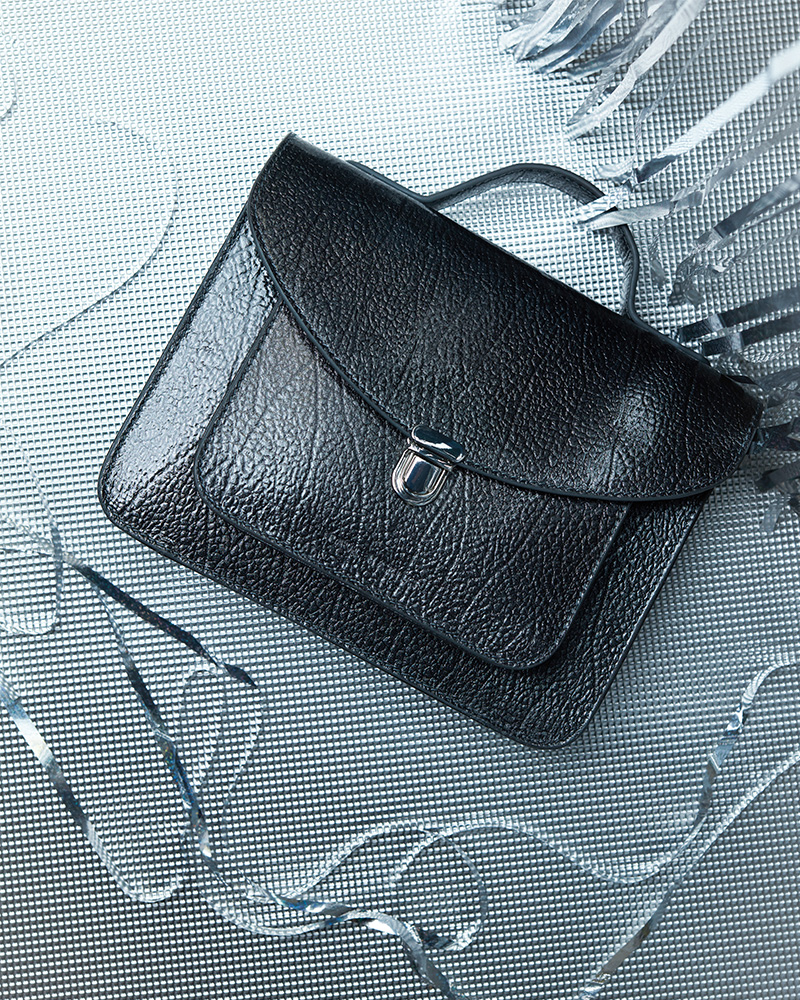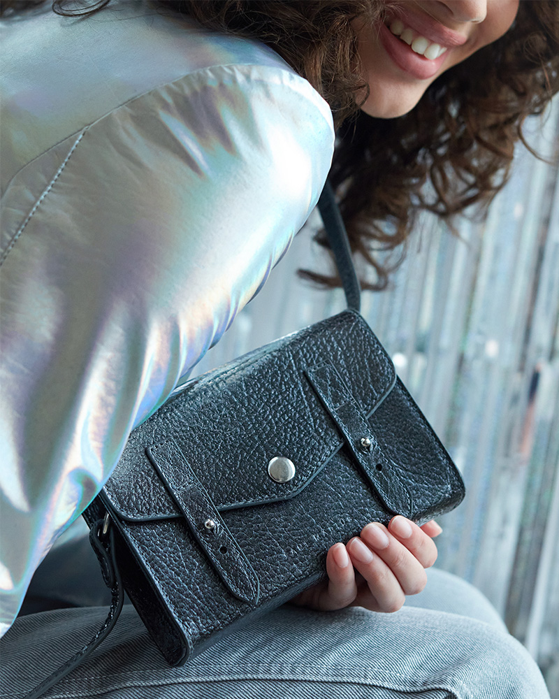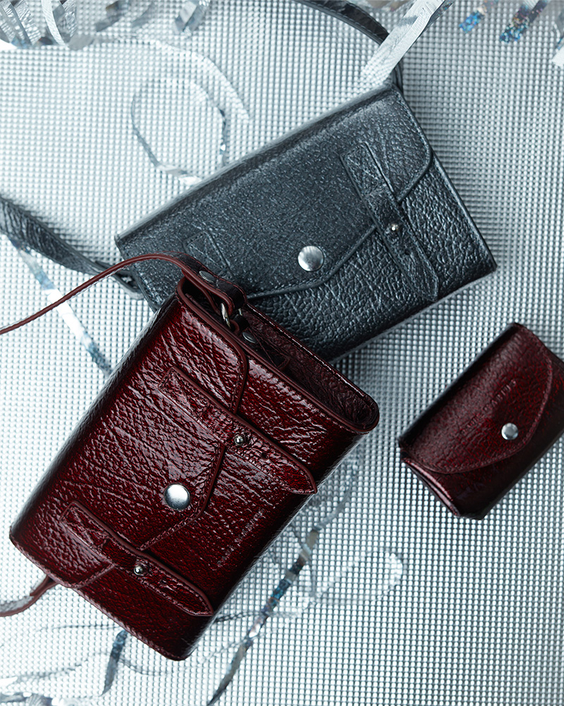 a metallic grained leather, enhanced with a glossy finish that reveals its full character.